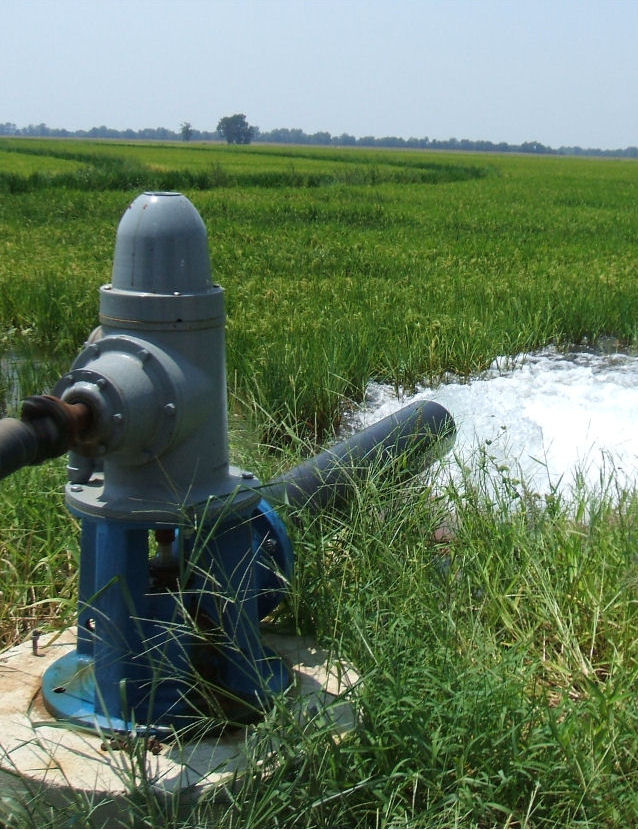 Bombeamento de água subterrânea para irrigação. Foto de David E. Burt, U.S. Geological Survey, domínio público.